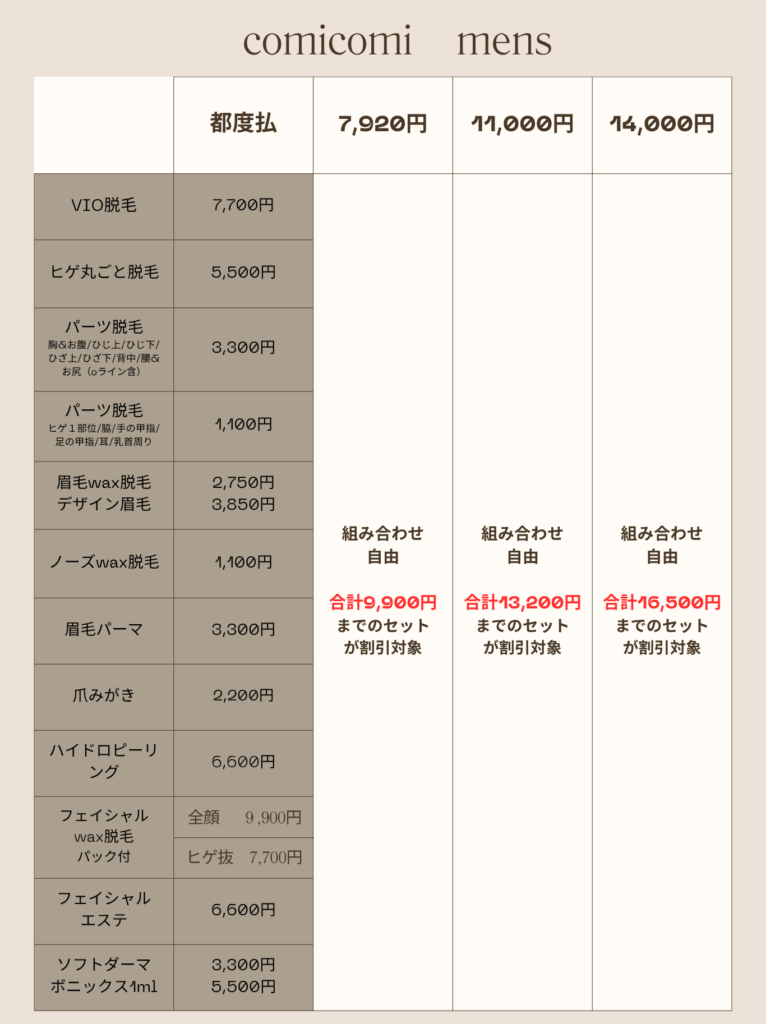 comicomi 2つ以上のメニューを組み合わせると超お得になるセットプランです。 お好きなメニューを組み合わせてみてくださいね! 7,920円コースの一例 11,000円コースの一例 14,000円コースの一例
